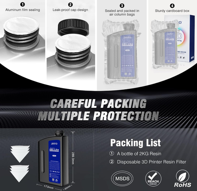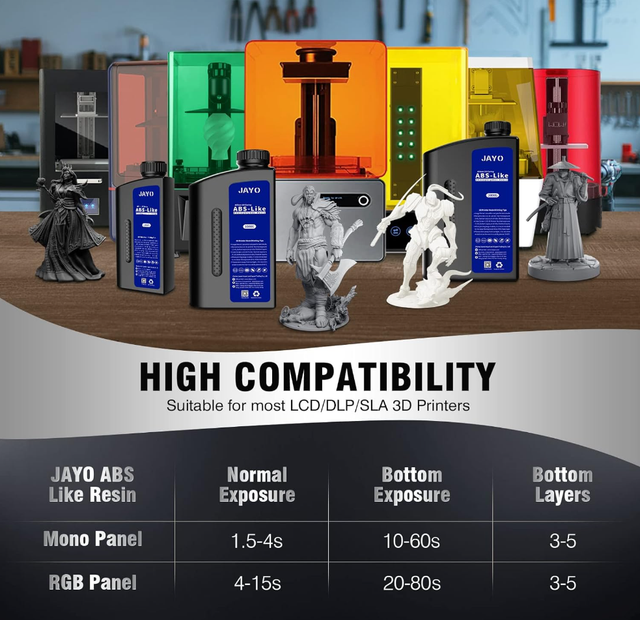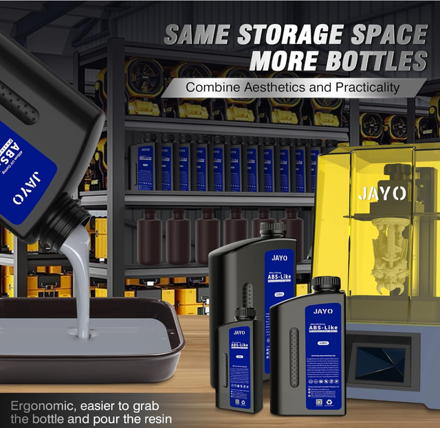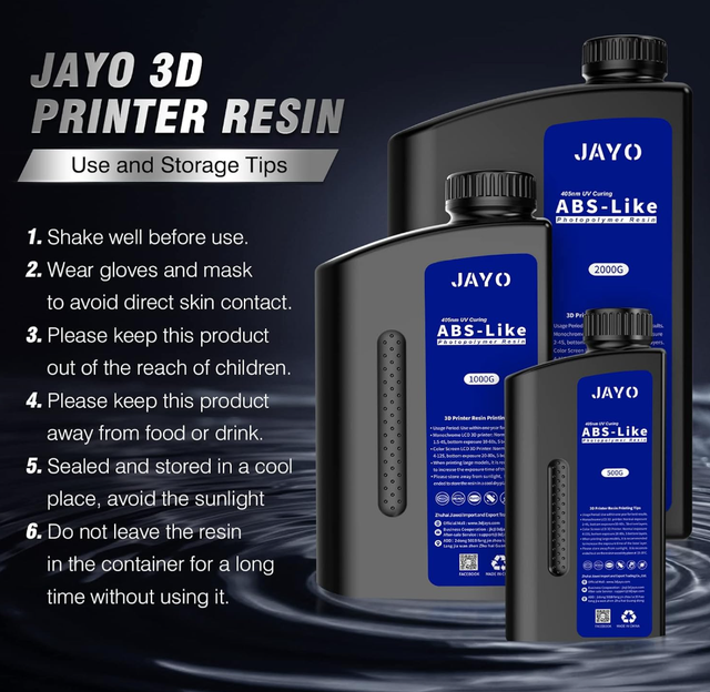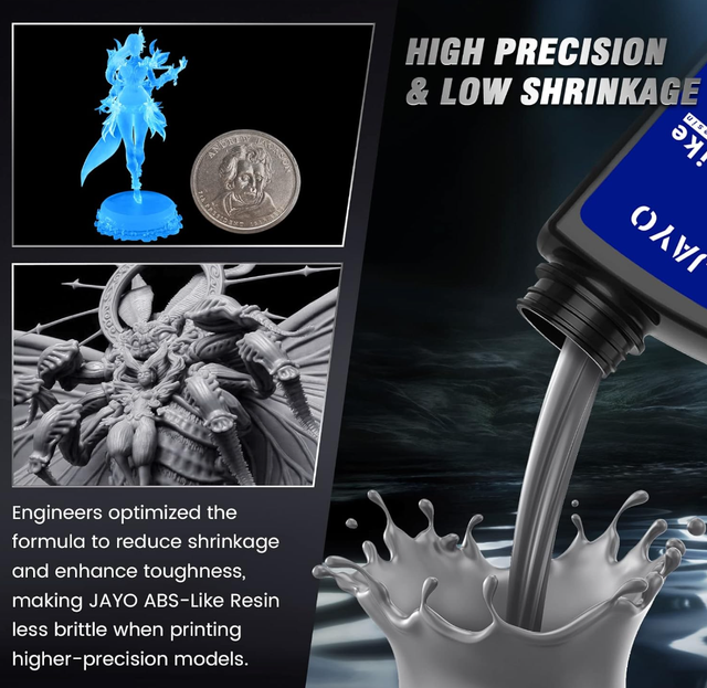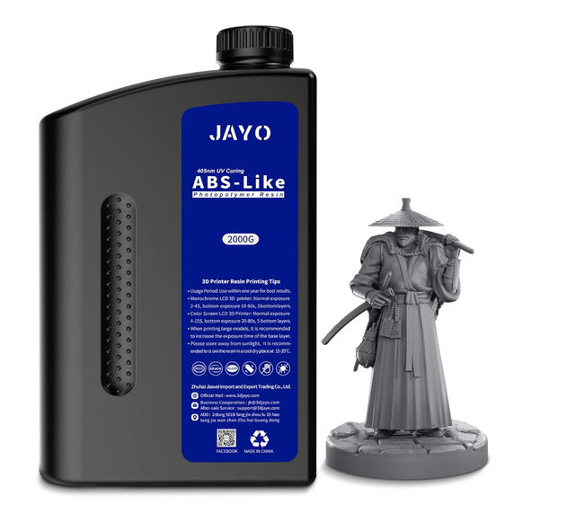 ABS-Like Photopolymer Resin von JAYO für LCD/DLP/SLA-3D-Drucker mit 405 nm UV-Licht. Das Material ist auf detailreiche Drucke ausgelegt und eignet sich besonders für Miniaturen, Figuren, Prototypen und technische Bauteile mit feinen Strukturen.